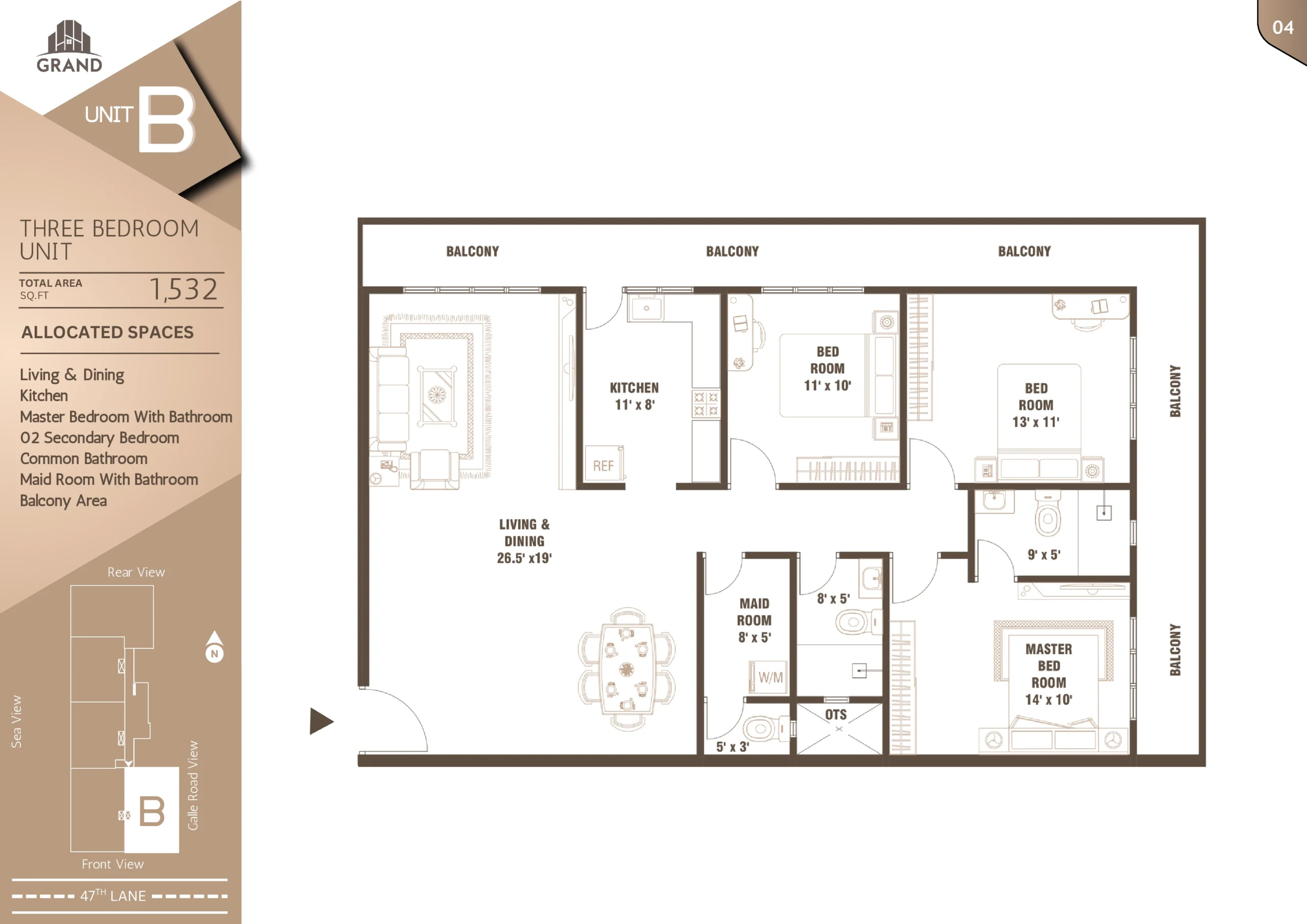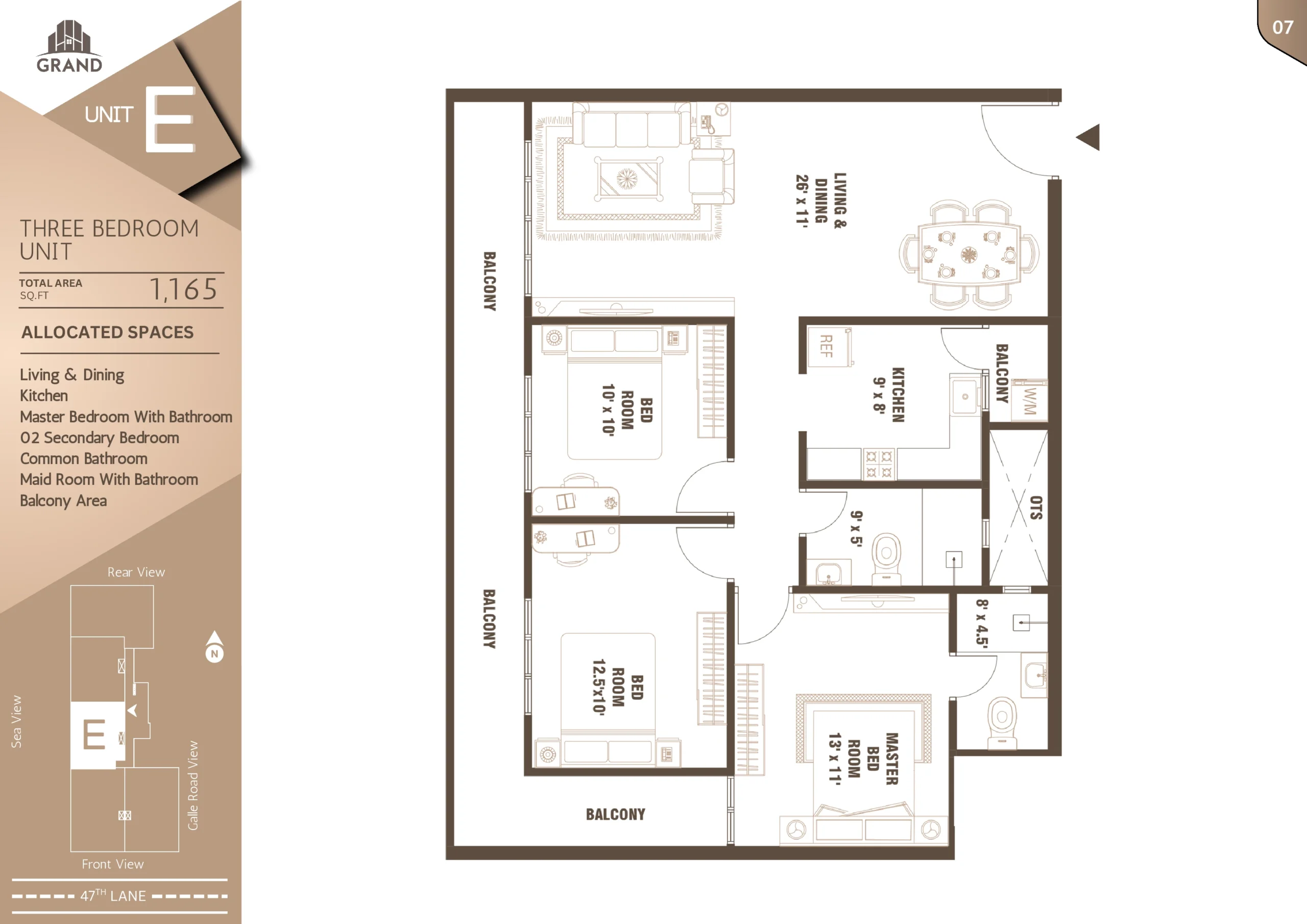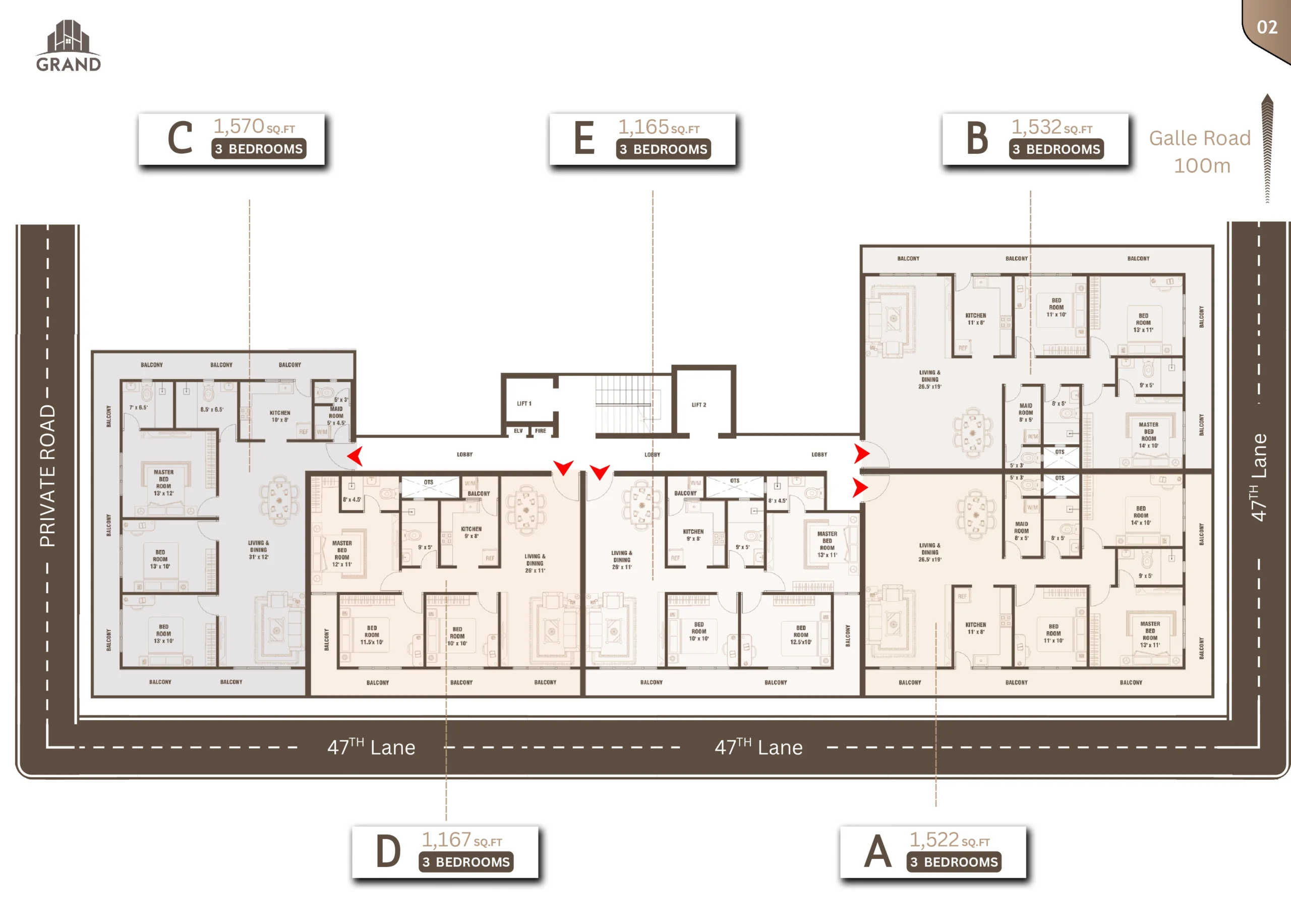 Nestled just 100 meters off Galle Road on 47th Lane, Grand Edge offers a rare balance of urban accessibility and peaceful living. Located in the heart of Wellawatte, Colombo 06, this exclusive development features 90 well-designed 3-bedroom apartments spread across 22 floors.